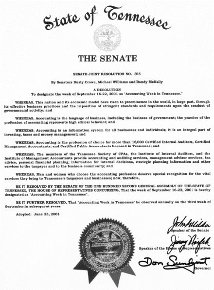 In 2001, Governor Don Sundquist designated the third week in September to be “Accounting Week in Tennessee.” The resolution states, “Men and women who choose the accounting profession deserve special recognition for the vital services they bring to Tennessee taxpayers and businesses.”